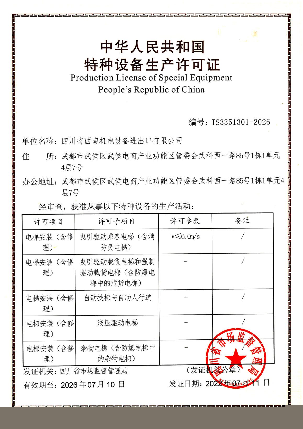 四川省西南機電設備進出口有限公司是具有進出口經營權并代理銷售國內外機電、照明、建材產品及從事機電設備、空調設備、電梯設備、環保設備、電站設備、工程礦山設備、智能樓宇設備、照明工程、儀器儀表及自控系統的成套設計、供貨、安裝、調試、技術支持與人員培訓,并提供優質、高效服務的專業單位。公司具有國家建設行政主管部門頒發的照明工程設計專項乙級資質證書,建筑機電安裝工程專業承包二級、城市及道路照明工程專業承包一級、電子與智能化工程專業承包二級和安全生產許可證證書。具有四川省質量技術監督局頒發的電梯設備安裝A級、維修A級資質證書。現有員工70余人,其中一級注冊建造師2人,二級注冊建造師10余人、高級職稱3人,中級職稱20余人、專職安全員5人、管理及技術人員30余人。